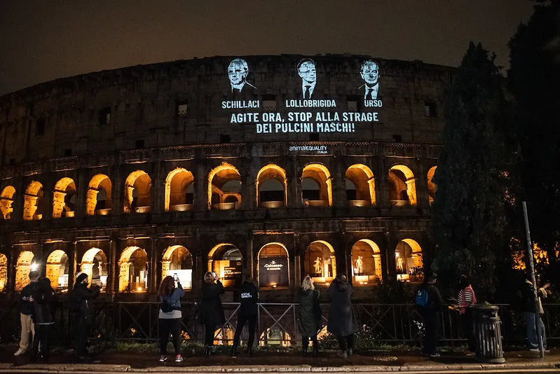 February 2025: We light up the Colosseum, saying ‘Stop the slaughter of male chicks’. We projected the faces of Ministers Lollobrigida, Schillaci, and Urso – those who could change the chicks’ fate – and a video showing the truth about chick grinding.