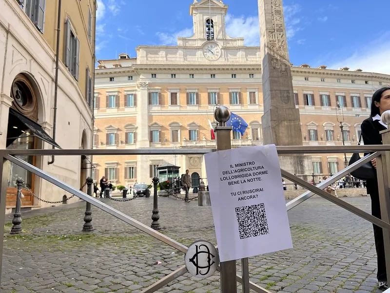 April 2025: Does Lollobrigida sleep well at night? We covered several Italian cities with posters exposing the Government’s silence.
