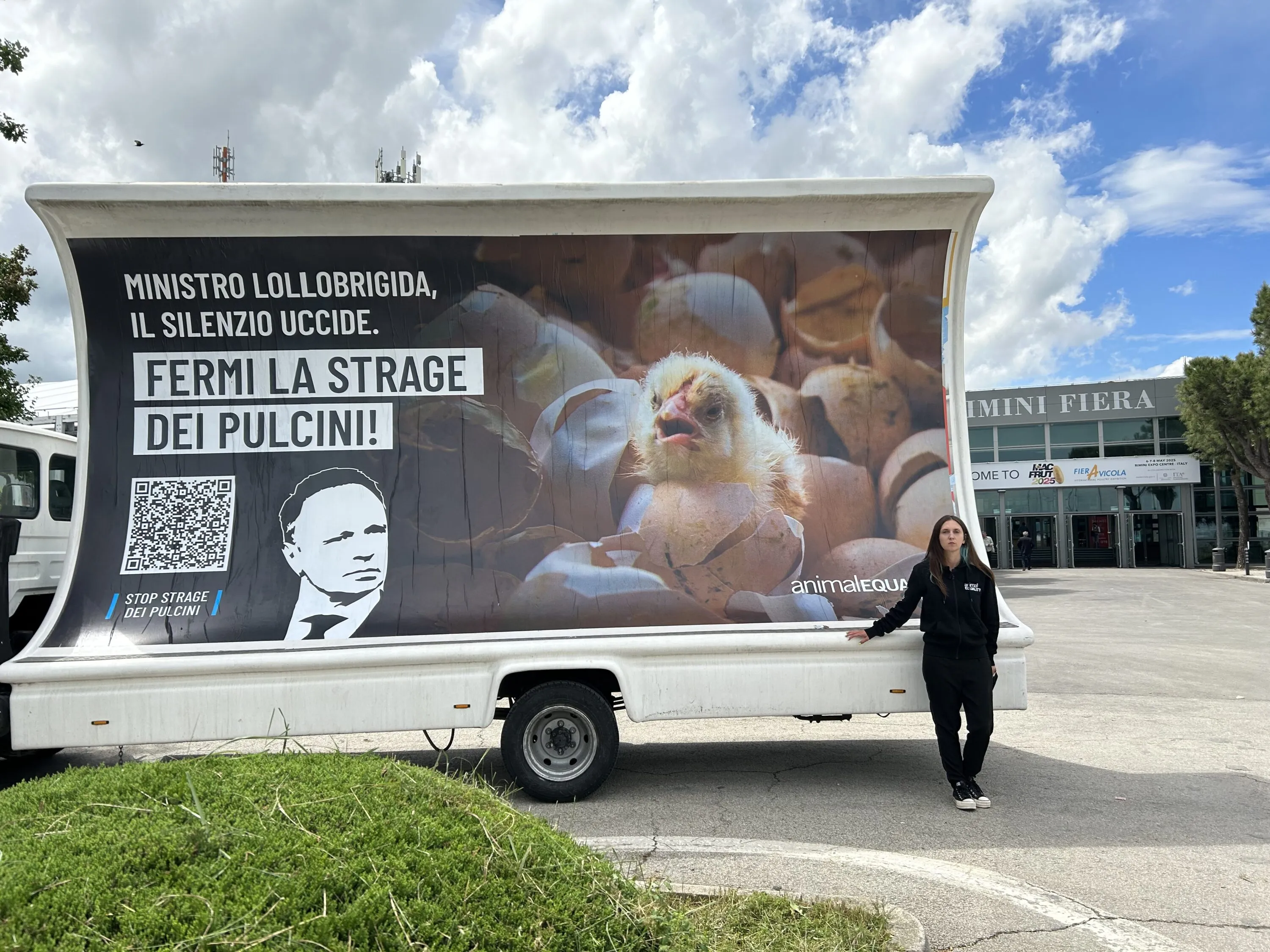 May 2025: MACFRUT fair, Rimini: we confronted Minister Lollobrigida about the shameful delays blocking the ban, while our mobile billboard circled the fair throughout the event.