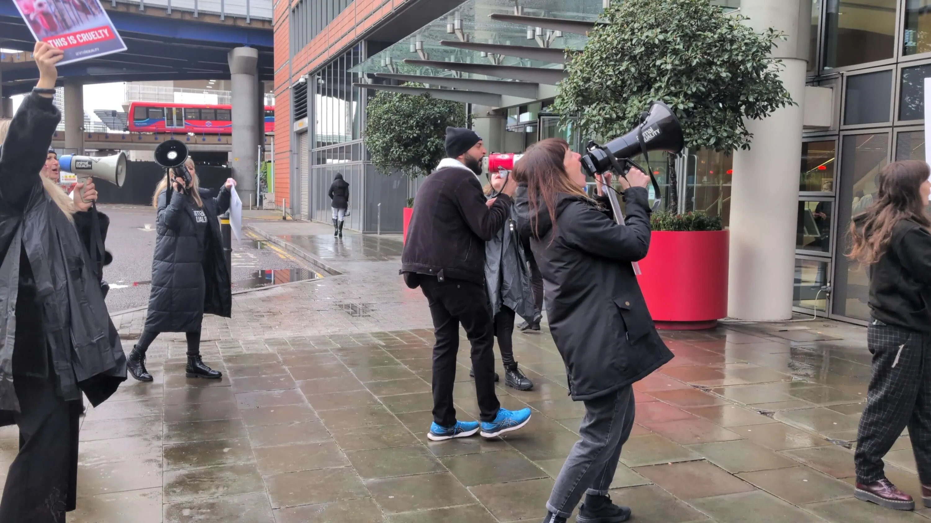Armed with megaphones, whistles, air horns, drums, placards and a powerful digi-van, campaigners made sure Marriott’s broken promise could not be ignored. The peaceful protest took place outside a Canary Wharf Marriott hotel, where senior business leaders were attending a Hotel Front Office Forum.