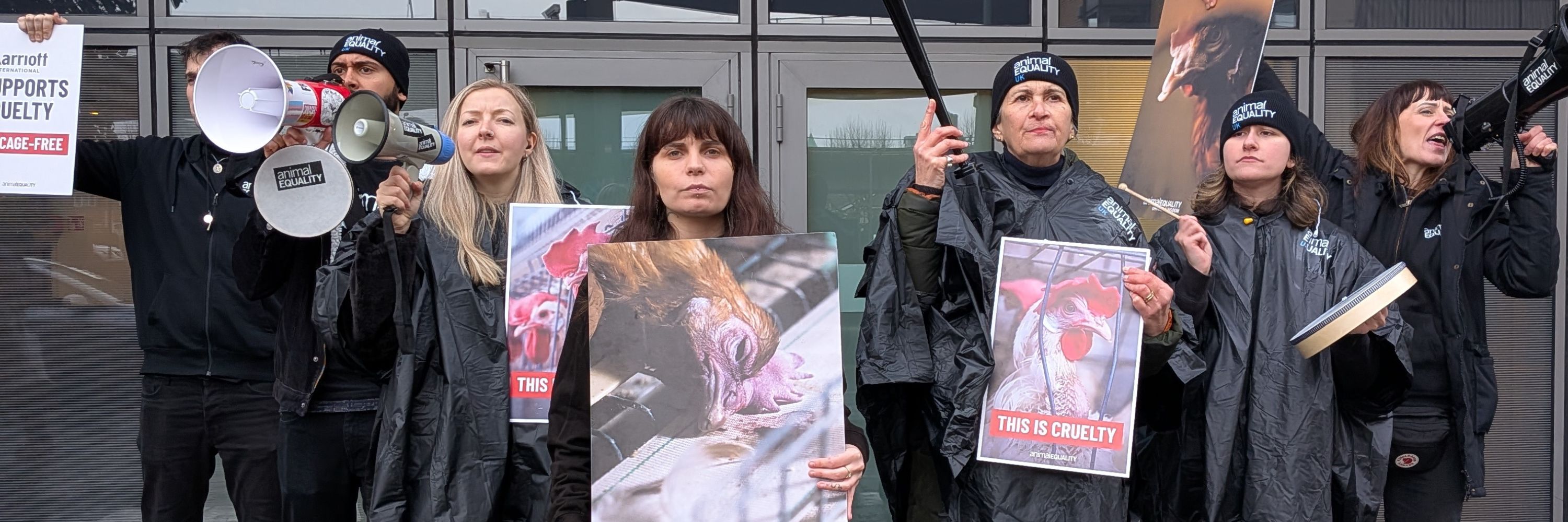Yesterday, Animal Equality activists took to Canary Wharf to confront Marriott over its failure to deliver on its global cage-free egg commitment by the end of 2025.