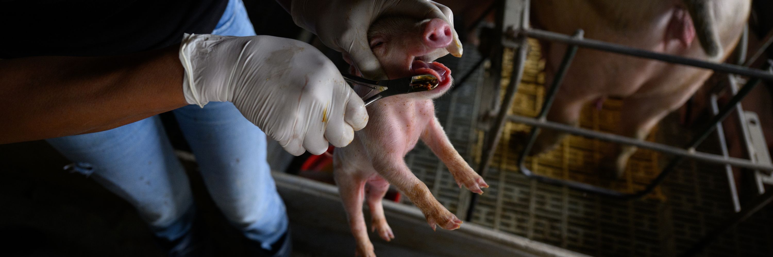 On both farms, workers cut piglets’ tails and castrated males without anesthesia. Investigators also documented teeth-clipping, an industry practice used to reduce biting in crowded conditions.